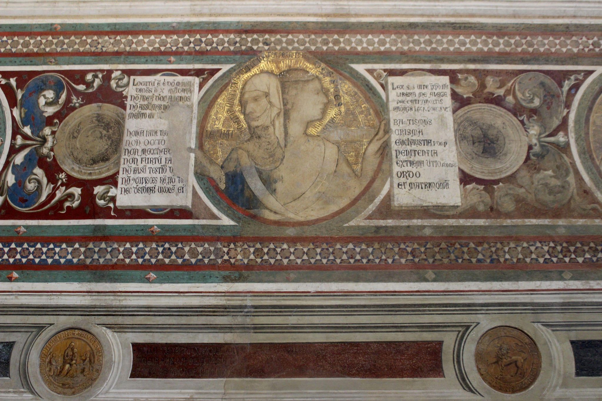 In maniera simmetrica ai dieci comandamenti sono invece elencati i sette sacramenti con una introduzione significativa che ricorda la presenza del peccato in ognuno, a motivo del peccato originale, e quindi la necessità dell’ausilio dei Sacramenti, perché sia garantito un governo giusto.
