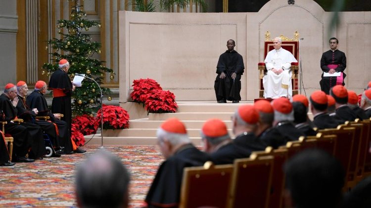 Con tale letizia nel cuore, e con senso di profonda gratitudine, possiamo guardare agli eventi che si susseguono, anche nella vita della Chiesa. Così, ormai quasi alla vigilia delle Feste natalizie, mentre saluto cordialmente tutti voi e ringrazio il Cardinale Decano per le sue parole – sempre piene di entusiasmo: oggi il Salmo ci dice che sono settanta i nostri anni, ottanta per i più robusti, e allora celebriamo anche con voi –, desidero anzitutto ricordare il mio amato predecessore Papa Francesco, che in questo anno ha concluso la sua vita terrena. La sua voce profetica, il suo stile pastorale e il suo ricco magistero hanno segnato il cammino della Chiesa di questi anni, incoraggiandoci soprattutto a rimettere al centro la misericordia di Dio, a dare maggiore impulso all’evangelizzazione, ad essere Chiesa lieta e gioiosa, accogliente verso tutti, attenta ai più poveri.