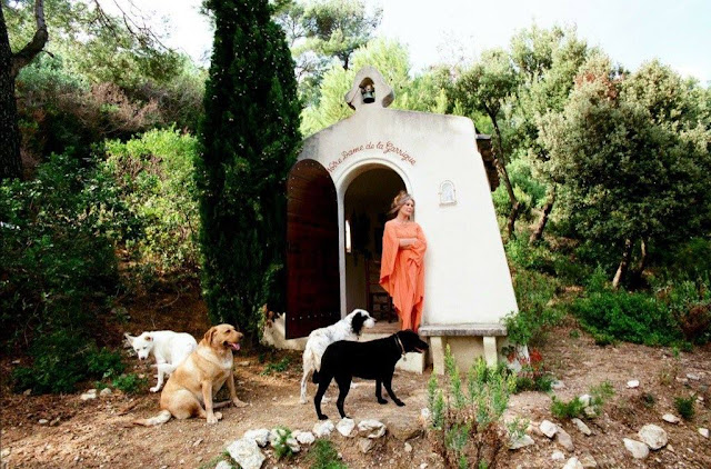 È in cima a una mulattiera, nel mezzo di una natura selvaggia e incontaminata, con una magnifica vista sul Big Blue, che negli anni Ottanta l’attrice si è fatta costruire quest’intimo rifugio spirituale, il «bidet dell’anima», ironizza lei, che ha chiamato “Madonna della Garrigue” dal nome della sua seconda residenza, sulla collinetta del Capon, una piccola porzione di bosco in Costa Azzurra, acquistata per sfuggire ai fotografi che la braccavano continuamente. Dentro la cappellina, d’ispirazione messicana, due sedie in legno e paglia, oggetti sacri antichi trovati al mercato di Place des Lices, il messale d’avorio della bisnonna e, alle pareti, tutte le effigi mariane che più ama, da Nostra Signora di Fatima alla Regina della Pace di Medjugorje. Oltre al ritratto di Padre Pio e a una piccola statua del Poverello d’Assisi. Quella della Vergine che domina, al centro, le fu donata da Gérard Montel. Brigitte l’ha chiamata “La Perruquière”, in omaggio al dato amico e parrucchiere scomparso, ma anche a significare che la Madre del cielo fa che tutti i nodi vengano al pettine. Dietro questa statua, Brigitte mette sotto la protezione della Vergine le foto dei cari defunti, anche quelle dei suoi animali volati in cielo.