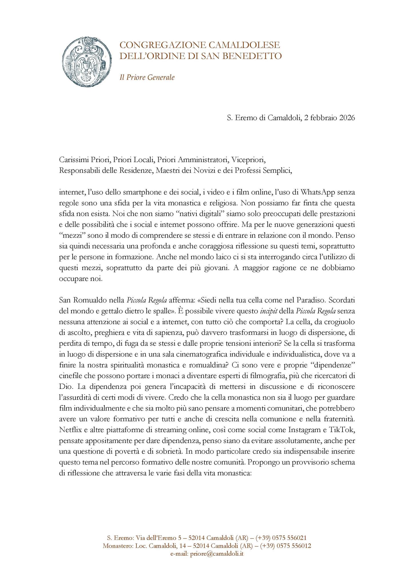 Riprendiamo sul nostro sito una trascrizione de Gli scritti di una lettera scritta dal priore di Camaldoli, dom Matteo Ferrari, ai diversi responsabili dell’ordine monastico e pubblicata sul suo profilo FB in tre distinte immagini. I neretti sono nostri ed hanno l’unico scopo di facilitare la lettura on-line. Restiamo a disposizione per l’immediata rimozione se la presenza sul nostro sito non fosse gradita a qualcuno degli aventi diritto. Per ulteriori testi, cfr. le sezioni Educazione e media e Ecclesiologia.