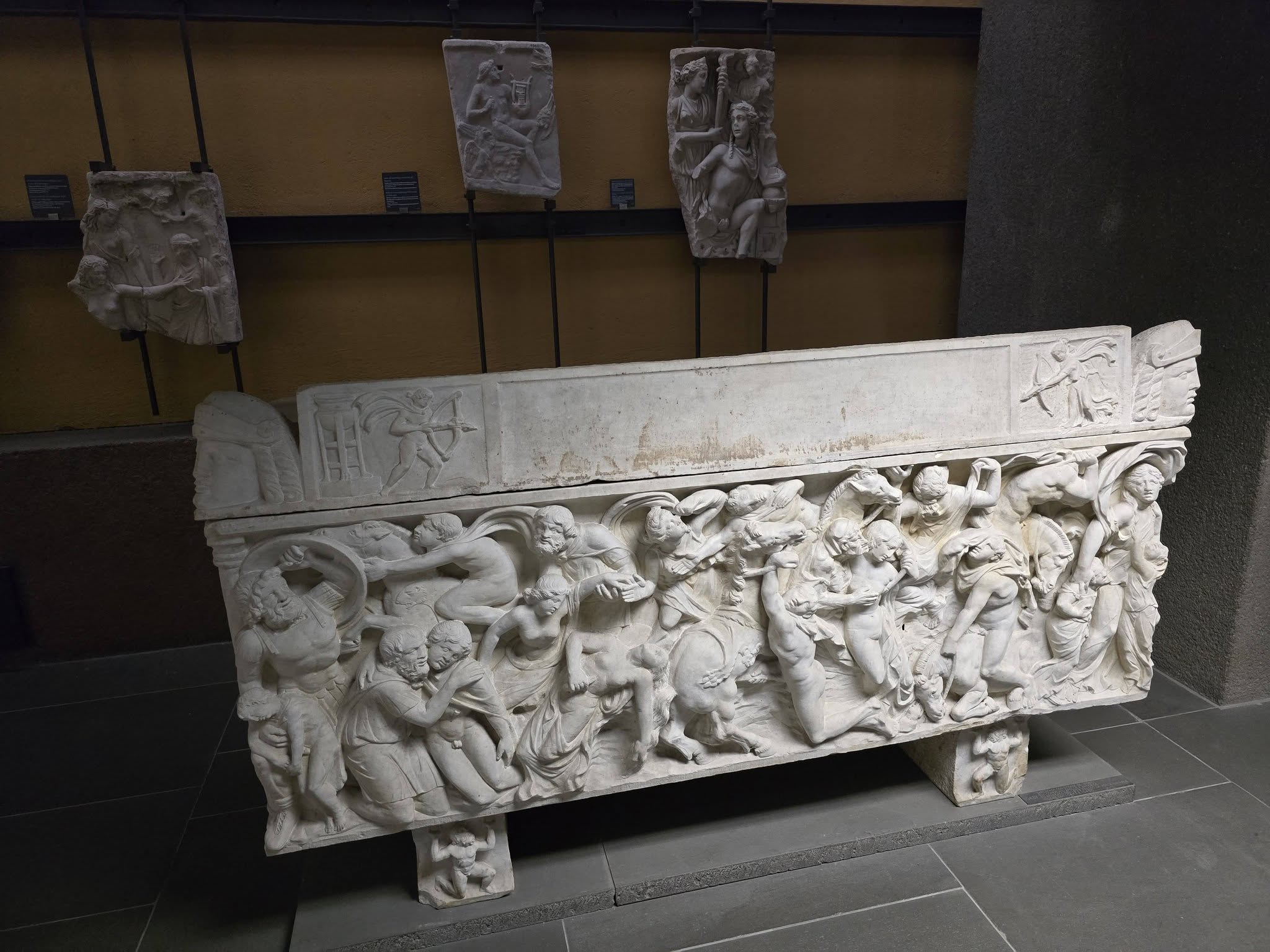 La fronte del sarcofago descrive la strage dei quattordici figli di Niobe, sette maschi e sette femmine.