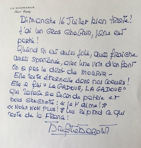Si pensi solo al biglietto che scrisse alla morte di Jane Birkin, dove è B.B. stessa a dire che la cantante/attrice è ora fuori della “galoure”, cioè del “fango”, dove il riferimento, oltre che alla canzone cantata dalla Birkin stessa, è alla Francia, come è evidente nella chiusa dove afferma che “ciò che resta della Francia” la ama ancora!