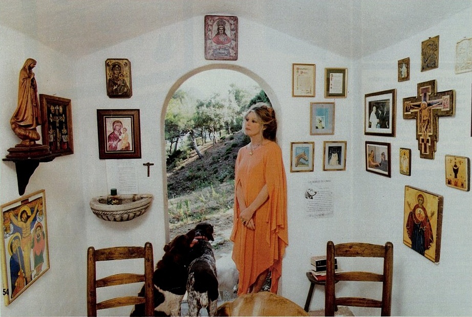 È in cima a una mulattiera, nel mezzo di una natura selvaggia e incontaminata, con una magnifica vista sul Big Blue, che negli anni Ottanta l’attrice si è fatta costruire quest’intimo rifugio spirituale, il «bidet dell’anima», ironizza lei, che ha chiamato “Madonna della Garrigue” dal nome della sua seconda residenza, sulla collinetta del Capon, una piccola porzione di bosco in Costa Azzurra, acquistata per sfuggire ai fotografi che la braccavano continuamente. Dentro la cappellina, d’ispirazione messicana, due sedie in legno e paglia, oggetti sacri antichi trovati al mercato di Place des Lices, il messale d’avorio della bisnonna e, alle pareti, tutte le effigi mariane che più ama, da Nostra Signora di Fatima alla Regina della Pace di Medjugorje. Oltre al ritratto di Padre Pio e a una piccola statua del Poverello d’Assisi. Quella della Vergine che domina, al centro, le fu donata da Gérard Montel. Brigitte l’ha chiamata “La Perruquière”, in omaggio al dato amico e parrucchiere scomparso, ma anche a significare che la Madre del cielo fa che tutti i nodi vengano al pettine. Dietro questa statua, Brigitte mette sotto la protezione della Vergine le foto dei cari defunti, anche quelle dei suoi animali volati in cielo.