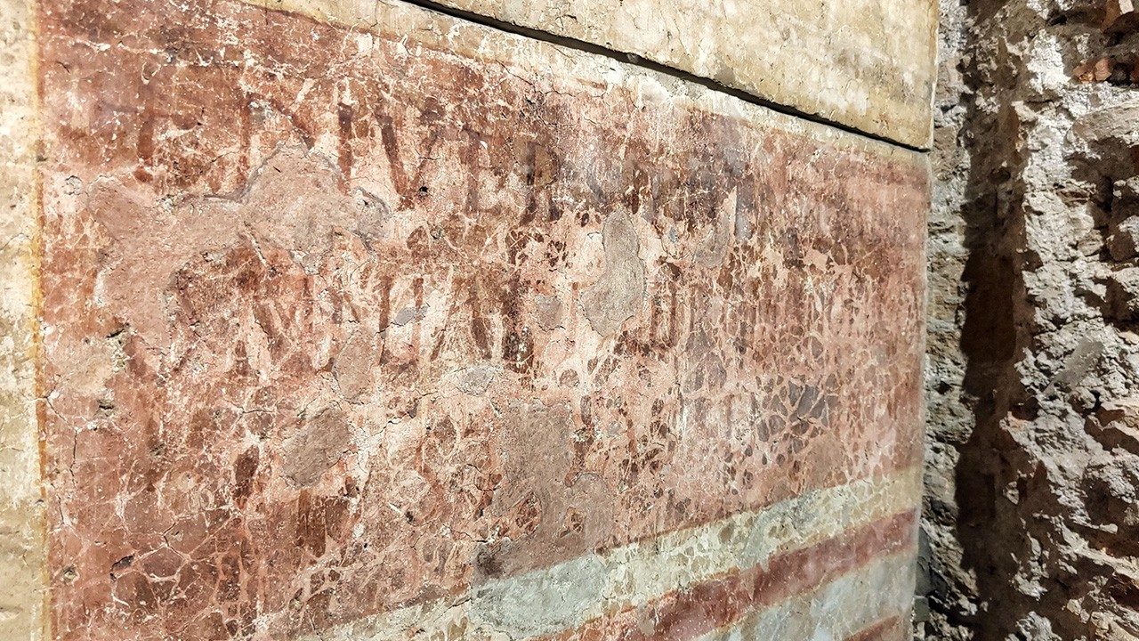 Ma che funzione aveva questo affresco all’interno delle stanze del Patriarchio? L’ipotesi più accreditata era parte della decorazione della sezione latina della biblioteca del Palazzo Papale. Secondo un uso tipico del mondo antico infatti le raccolte di libri prevedevano una duplice suddivisione dei testi in base alla lingua: greca e latina. Agostino con la sua effigie dunque insigniva l’aula in cui erano conservati gli scritti patristici dell’antica lingua d’Occidente cristiano.